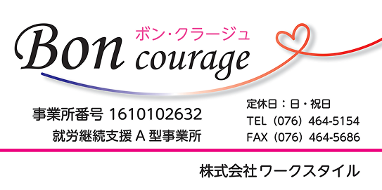 私たち「ボン・クラージュ」では、一人ひとりの才能と可能性を最大限に引き出すための環境を提供しています。ここでは、あなたの個性が輝き、新しい可能性へと挑戦できる場所です。 お問い合わせ 076-464-5154 インスタグラムはじめました! About us ようこそボン・クラージュ へ 私たちは、個人の尊厳と人権を尊重し、一人ひとりの希望に基づく自立生活を支援する就労継続支援A型事業所です。利用者の皆様に安全で安心できる福祉サービスを提供し、地域社会と共に成長していくことを目指しています。 会社概要 サイト案内 A型事業所とは就労継続支援A型事業所についての基本情報と、私たちが提供するサポートの詳細をご紹介します。 詳細はこちら 利用の流れ当施設のサービスを利用するまでの手順を簡潔に解説します。安心してスムーズにサービスを始められるように支援します 詳細はこちら お問い合わせご質問やご相談がありましたら、こちらからお気軽にお問い合わせください。スタッフが迅速に対応いたします。 詳細はこちら 公表情報 令和6年度 情報公開スコア表 令和6年度のスコア表...Read More 令和5年度 情報公開スコア表 令和5年度のスコア表...Read More アクセスマップ